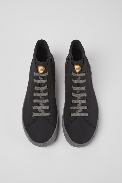Bottines En Textile Noir Pour Homme. Tige 80 % PET Recyclé Avec Semelle Extérieure En EVA Contrasté, Assise Plantaire OrthoLite® Recyclée Et Lacets élastiques. Meilleur Produit : 100 % Du Tissu Utilisé Est En PET Recyclé Afin D'éliminer Le Plastique Vierge Et De Réduire Les émissions De Carbone Tout Au Long De Notre Chaîne D'approvisionnement. 20 % De La Semelle Extérieure Est En EVA Recyclé, Ce Qui Aide à Éliminer Les Déchets Et À Réduire Les Émissions D'empreinte Carbone Dans Un Impact Environnemental Plus Conscient, Tout En Conservant Les Mêmes Performances Et Normes Que L'EVA Vierge. Peu Touring Est Une Version Plus Sportive De Notre Emblématique Peu, Enrichie D'améliorations Techniques Et D'une Courbe Reconnaissable Sur La Semelle Extérieure.