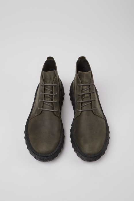 Chaussures Pour Homme En Nubuck Vert Foncé Avec Assise Plantaire OrthoLite® Recycled™ Et Semelle Extérieure En Caoutchouc Michelin (27 % Naturel). Ground Réinvente Le Style De Rue Urbain En Ajoutant Une Touche Contemporaine À L'esthétique Industrielle Camper.