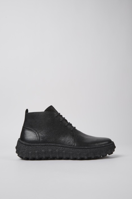 Bottine Noire à Lacets Pour Homme. Tige En Cuir Pleine Fleur Et Semelle Extérieure En Caoutchouc Michelin. Ground Réinvente Le Style De Rue Urbain En Ajoutant Une Touche Contemporaine À L'esthétique Industrielle Camper. La Semelle épaisse Composée D'un Mélange De Caoutchouc Standard Et Naturel Offre Une Adhérence Supérieure Grâce à La Technologie MICHELIN. Différents Matériaux Distinctifs Utilisés Pour La Semelle Et La Tige, Des Coutures À 360', Des Cuirs Premium Certifiés Par Le Leather Working Group Rehaussent Sa Silhouette Et Rehaussent Ce Style Pour L'hiver.