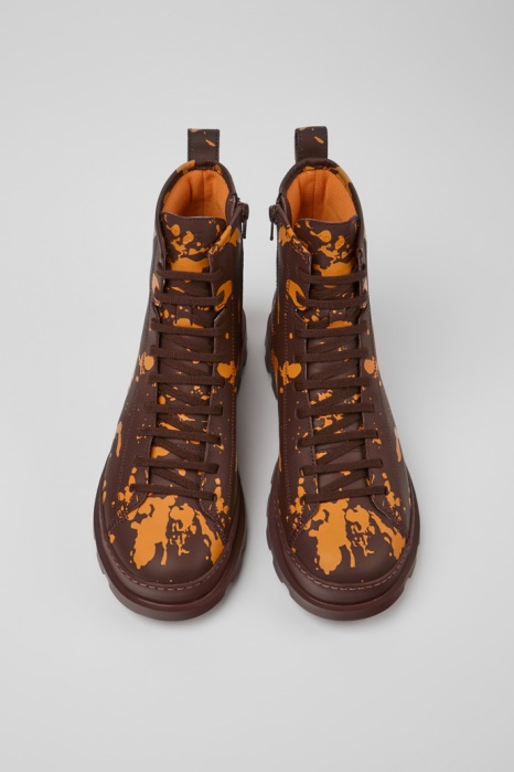 Bottines Pour Hommes En Cuir Bordeaux Et Orange Avec Un Imprimé Splash De Peinture, Des Semelles Intérieures En PU Et Des Semelles Extérieures XL EXTRALIGHT. Un Camper Original Depuis 1986 Avec Un Design Urbain Emblématique. Brutus Est Durable Grâce à Des Coutures à 360' Et Dispose D'une Technologie Légère.
