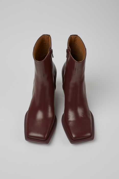 Bottines Pour Femme En Cuir Bordeaux Avec Assise Plantaire OrthoLite® Recycled™ Et Semelle Extérieure En Caoutchouc (20 % Recyclé). Karole Fait Partie De La Nouvelle Génération De Talons Hauts De Camper Qui Se Caractérise Par Une Silhouette Féminine Distinctive Et Un Bout Carré Prononcé Avec Une Semelle Extérieure Solide Et Saillante. .