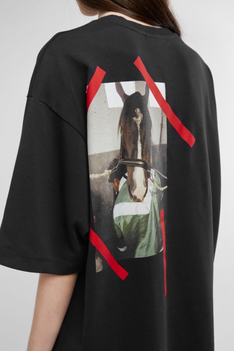 T-shirt Noir à Manches Courtes Et Col Rond 100 % Coton Biologique Avec Imprimé Cheval Et Effet De Bande Rouge à L'arrière Gauche Et étiquette Logo Camper Sur L'ourlet En Bas à Droite. Ce T-shirt Oversize Décontracté Présente Une Image En Forme D'affiche D'un Cheval De Trot Majorquin Tirée De La Campagne "The Walking Society" De Camper à L'arrière. Inspirée Des Racines De La Marque, L'île Méditerranéenne De Majorque, La Collection Combine Des Motifs équestres Avec Du Coton Biologique De Haute Qualité Et Des Formes Contemporaines À Porter Au Quotidien. Taille Et CoupeUnisexeConçu Pour Une Coupe Ample Et SurdimensionnéeLe Mannequin Homme Mesure 187 Cm Et Porte Une Taille L Le Mannequin Femme Mesure 175 Cm Et Porte Une Taille M