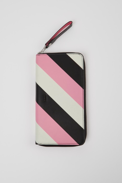Grand Portefeuille Zippé En Cuir à Rayures Noires, Roses Et Blanches. Le Design Ingénieux Et Compact Des Petits Accessoires Mosa Vous Permet De Rester Organisé Et Lucide Lors De Vos Déplacements. Découvrez Un éclair De Joie Camper Dans Leurs Intérieurs Lumineux Et Accrocheurs.