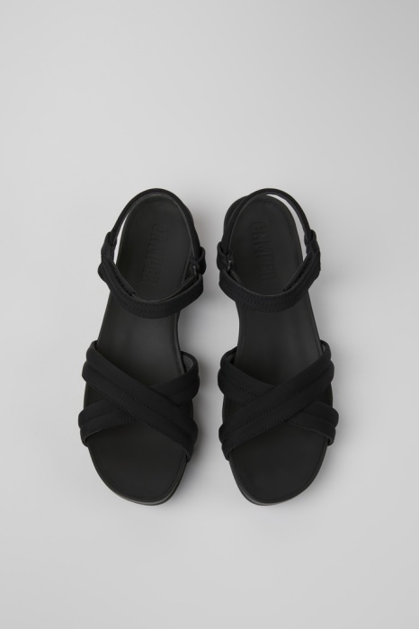 Sandales Noires Pour Femme En PET Recyclé Et Nylon Avec Semelle 100% Caoutchouc (20% Recyclé) Et Système De Fermeture Auto-agrippant.Petite Sœur De Notre Ligne Kaah, Minikaah Présente Une Mini Plateforme En Forme De Coin Avec Un Talon En Caoutchouc Et Un Conception Anatomique . Cette Ligne Féminine Offre Style Et Intrigue Sans Sacrifier La Stabilité Ou L'adhérence.