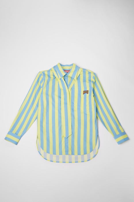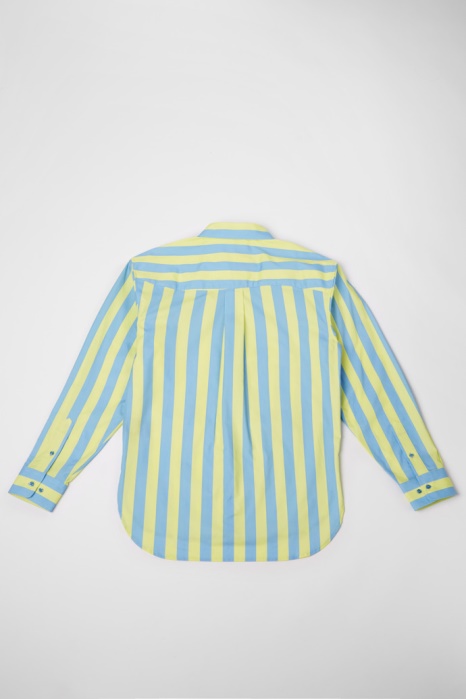 Chemise Unisexe à Rayures Bleues Et Jaunes Avec Un Col Et Une Cravate Amovible. 100% Coton Biologique. Reflétant L'esprit Libre De La Saison, La Collection Apparel Associe Des Couleurs Fraîches à Un Motif De Vagues Rappelant Les Journées Ensoleillées à La Plage.